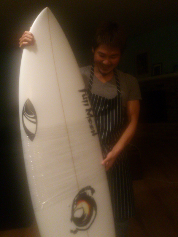 サーファーシェフTeruの新品カスタムボードも拝見。