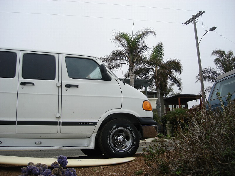 しょうがないので丘の上にヴァンを停め、そこから板を担いで徒歩移動となりました。