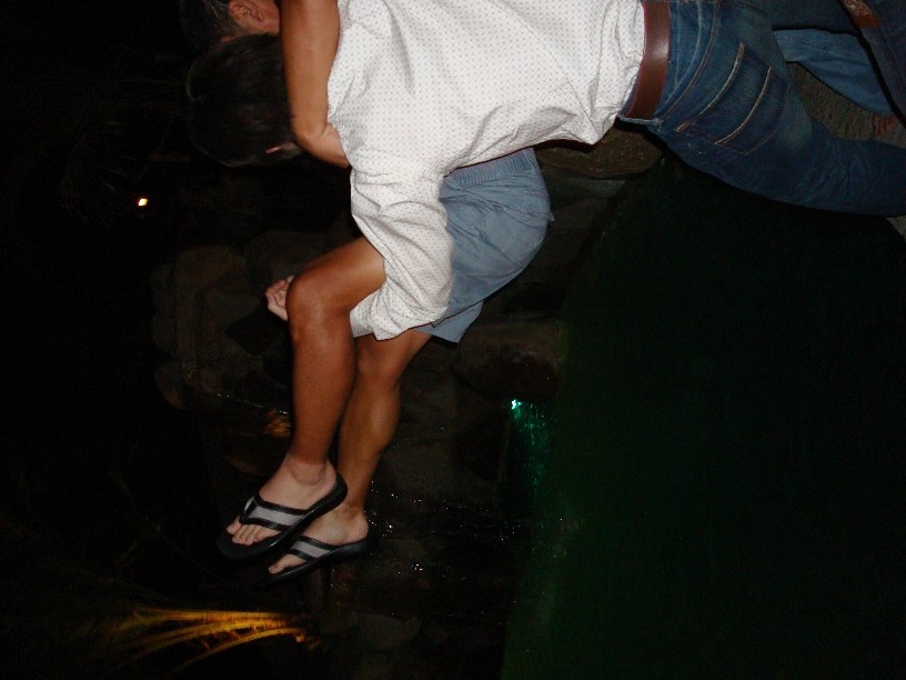 最後は恒例のプール落とし!抱き上げられて観念するHiroさんのリアルな映像です。(笑)
