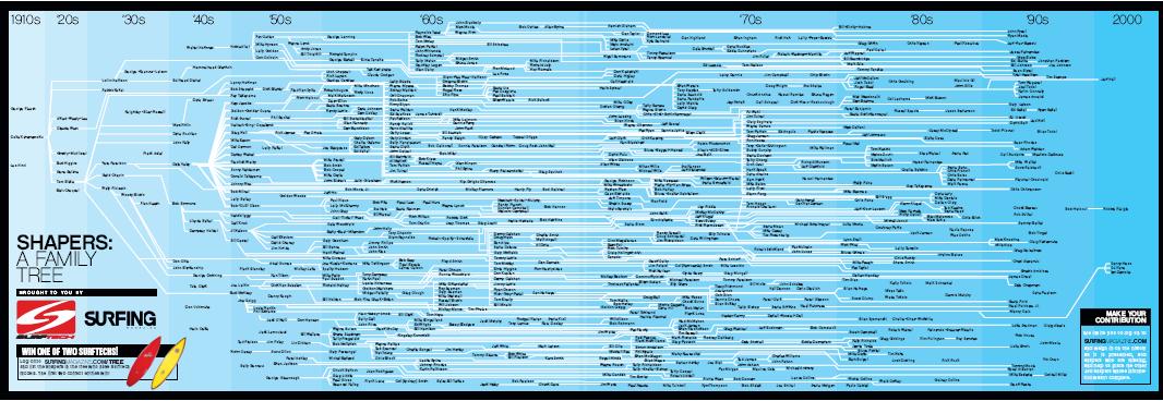 1900年初頭から現在に至るまでのシェイパー系譜図をまとめたもので、なかなか圧巻です。拡大版はこちらでぜひ。