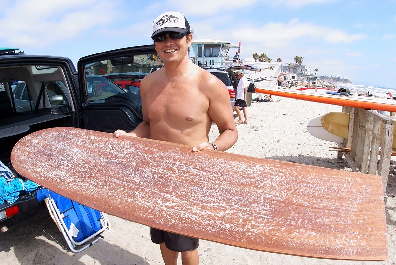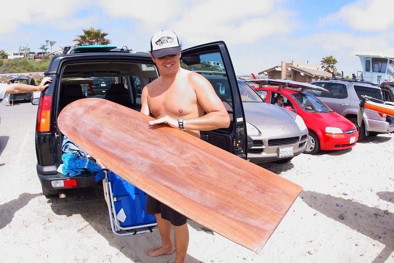 チャックはマホガニー素材を使ってシェイプした自作ボードを見せてくれた。7フィートながらかなりの重さ。