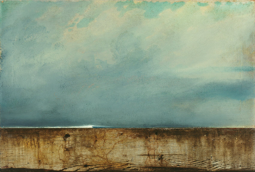 捨てられた木材をキャンバスにし、そのつなぎ目となる暗雲の水平線にきらめくひとすじの波が印象的な逸品です。