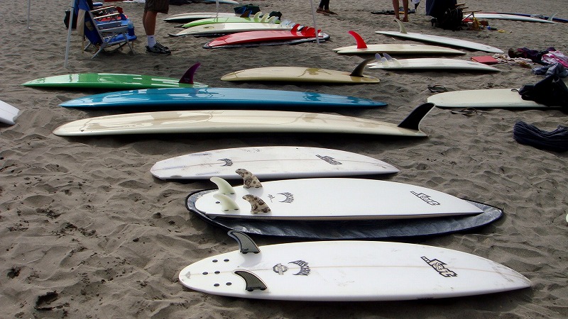 最初に目に留まったのはTYLERの10フィートクラフトマン(中央)。やはりシングルフィンにまず目を奪われます。