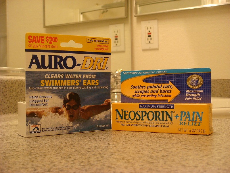 左は、目薬ならぬ耳薬。飛び跳ねても地面を蹴っても抜けない耳の中の水を、数滴落とすだけで簡単にすっきりさせてくれる優れもの。種類はいろいろあって、スイマーズイヤーと表記されていれば大丈夫です。