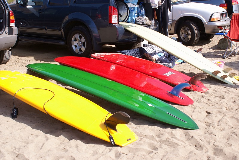 すっかり晴れ間も広がり、バリエーション豊かなボード群が砂浜に映える。