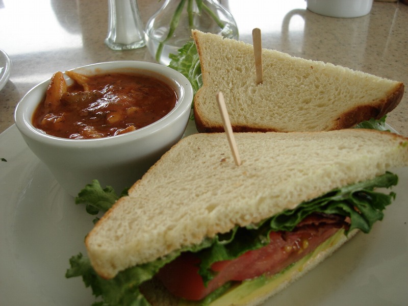 海を眺めながら、ベーコンレタストマトアヴォカドサンドイッチとミネストローネスープで締め括り。