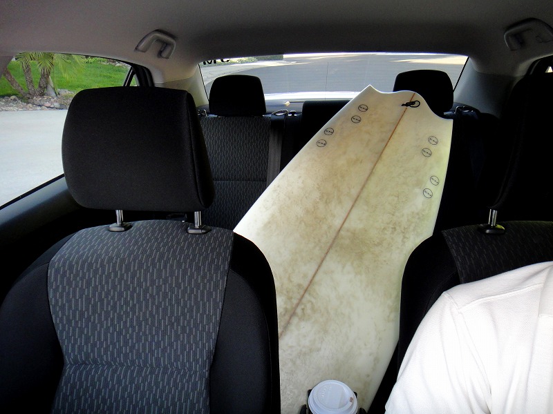 5’5”であればご覧の通り後部座席にすっぽり収まります。海に行けるだけでもよしとしないと。