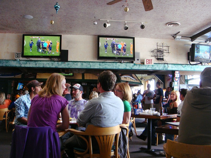 膝波セッションを早々に切り上げてスポーツバーに入ると、さすがに決勝ということで店内はほぼ満席。