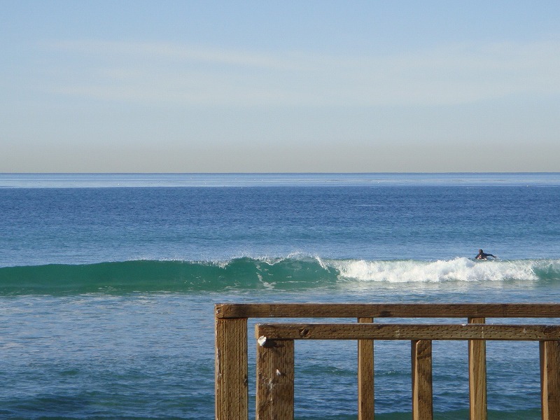 一夜明けて気温も上がり、久しぶりのうねりの谷間でKoichiと膝波リーフノスタルジーセッション。