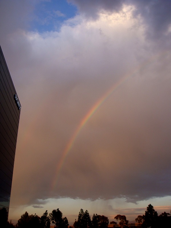 会社帰りに晴れているはずの上空から雨が降ってきたので、後ろを振り返ったらダブルレインボーが出現していた。