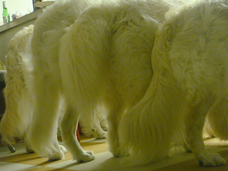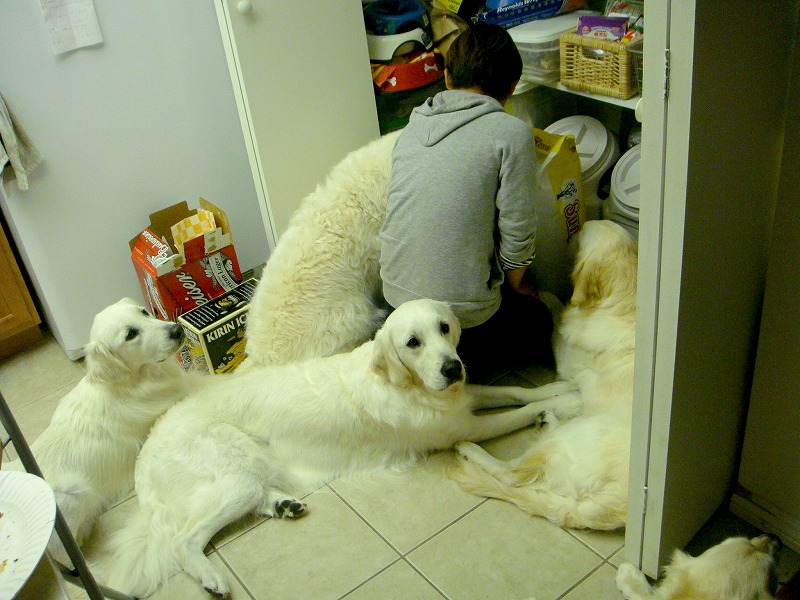 あさこが夕食の準備に入ると、このようにあっという間に子供たちに囲まれてしまいます。パブリックとアロハが寄り添うようにベストポジションを確保。