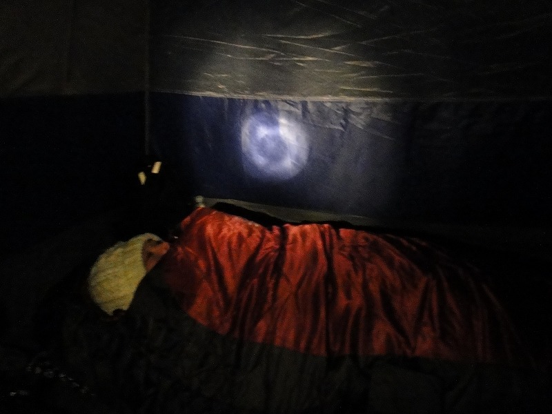 そして午後9時消灯。テント内は風を遮るので意外と暖かいですよ。