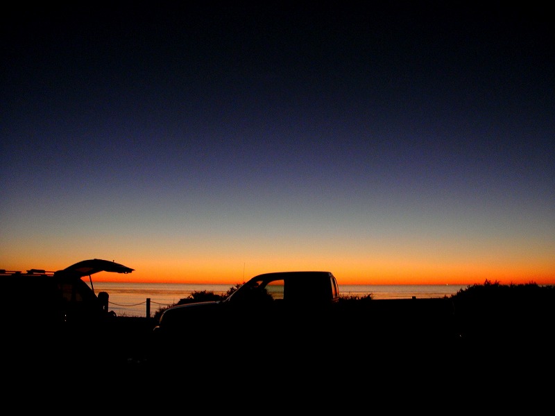沖にイルカが見え、クジラもいたらしく、そして水平線に沈む大きな夕陽は緑に光った。