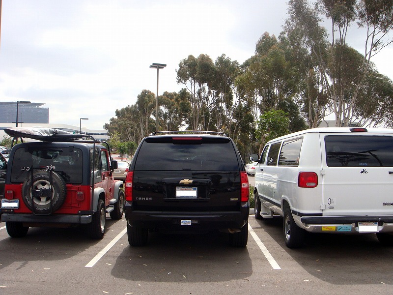 オフィスの駐車場に並ぶサーフ車両。左からTedのジープ号、Nobutatsuのタホー号、俺のダッジ。これから虫歯2本の治療と、
