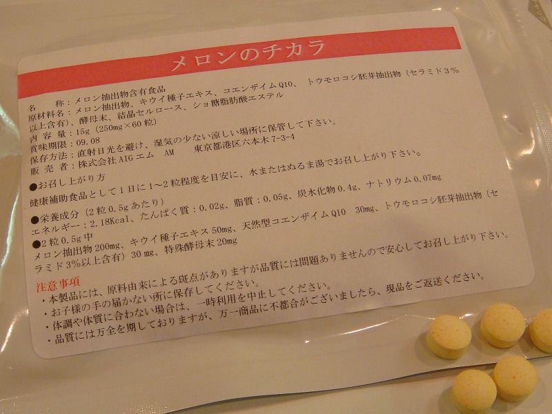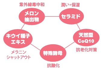 『ご存知でしたか!?いくら日焼け止めでガードをしても、紫外線が目にあたると炎症がおこり、その刺激が脳へ伝わり、脳からメラニン色素を作らせるホルモンがでて、陽に当たっていない場所にもシミ・ソバカスができてしまうという事実を。従来の「美白用」のサプリメントや化粧品は、できてしまったシミやソバカスを薄くするためのものが大半でしたが、弊社が開発した「メロンのチカラ」は紫外線毒を中和し、そもそもシミ・ソバカス自体を作らせないということに主眼を置いた、まったく新しいコンセプトのサプリメントです。』