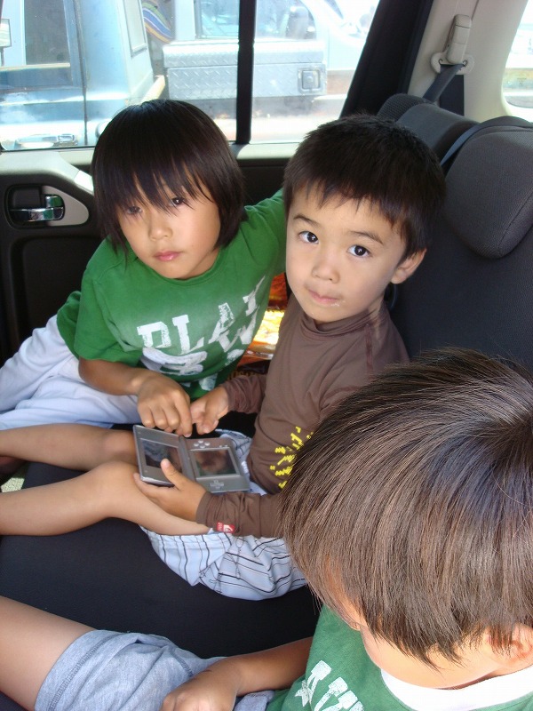 子供たちは車の中でDSに夢中。