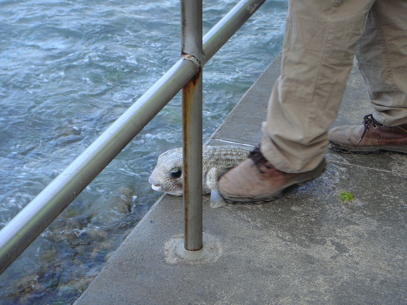シェラトンホテル前で約40センチのフグが釣り上げられていたが、運良くキャッチ&リリースされました。