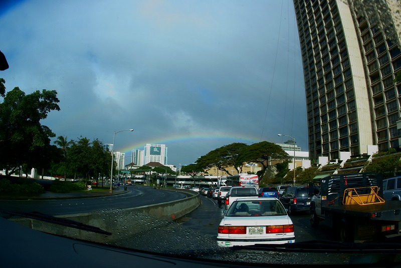 ホノルル国際空港に向かう送迎バスの中から見えた美しい虹にうっとりし、