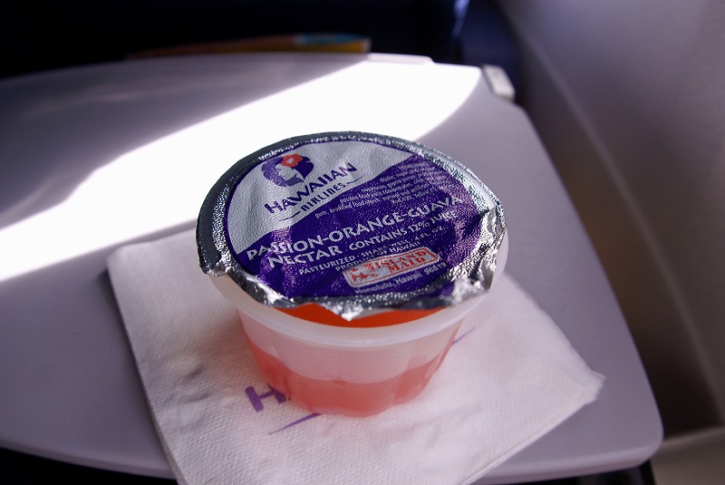 パッションオレンジとグアバのネクタージュースが、マウイ島までの短いフライトのささやかな楽しみ。