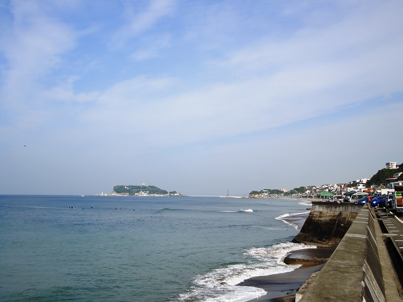 七里ヶ浜に到着。台風2号によるうねりのすじがうっすらとだけ見えました。