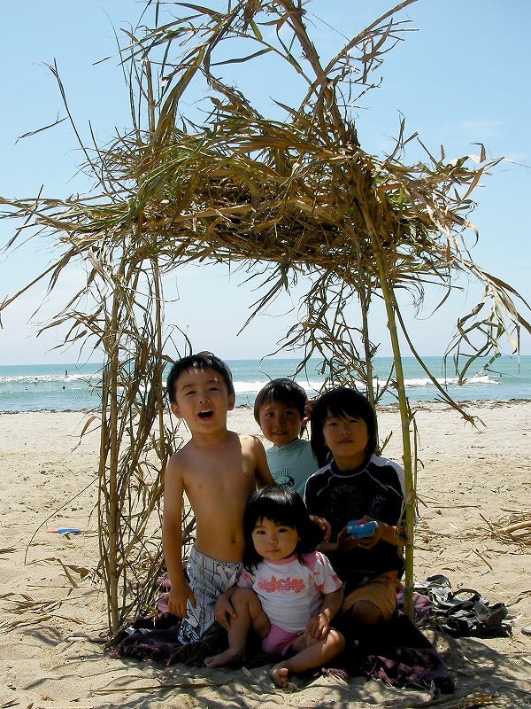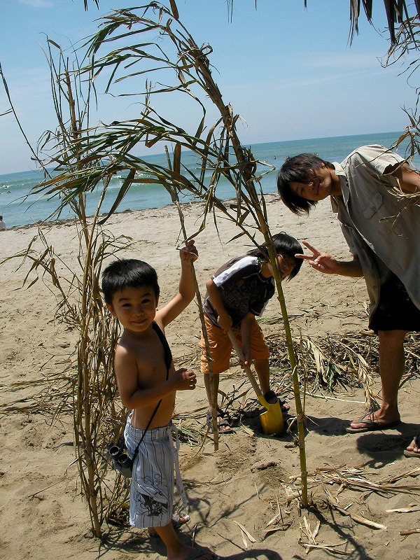 子供たちは彼らの指導の下、共同作業で海の家作りです。