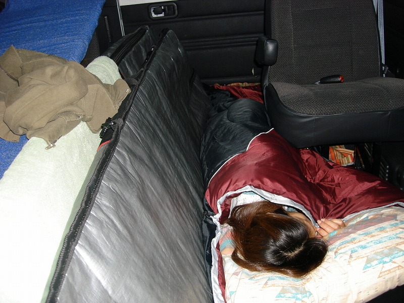 ヴァン後部でボードと一緒に横になるSue。