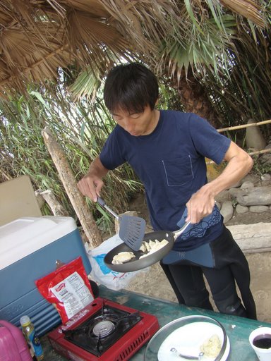 1Rを終え、持ち寄りのおにぎりやサンドイッチで楽しいランチタイム。そこへJohnが何と餃子を焼き始め、そのおいしさに悶絶!