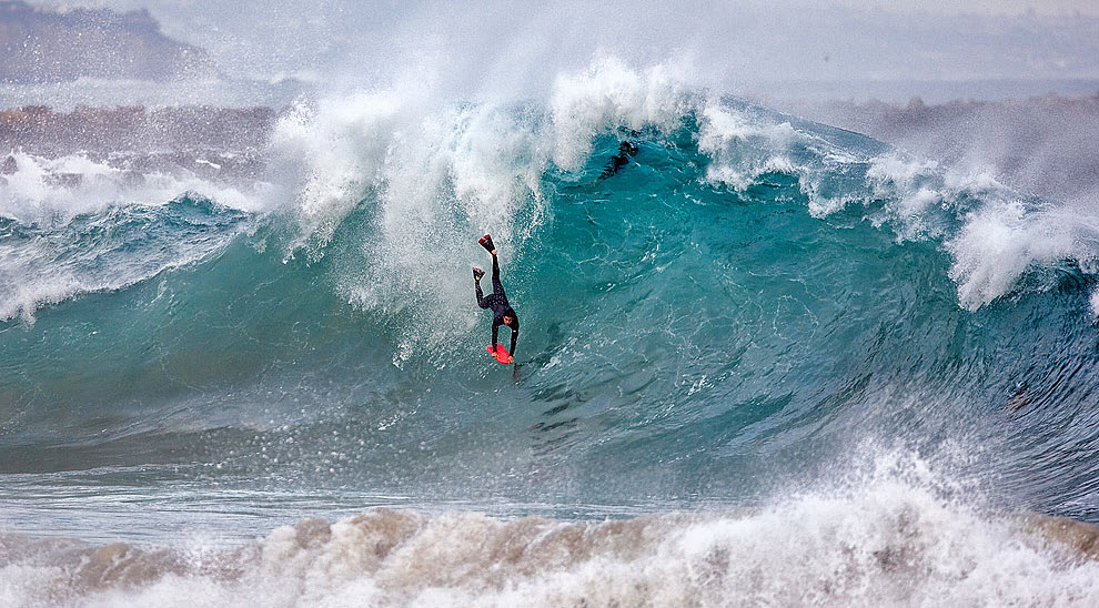 約15フィートにめくれ上がった波に吹き飛ばされたボディーサーファーが堤防の岩に叩きつけられ、命を落としたという不慮の事故がありました。