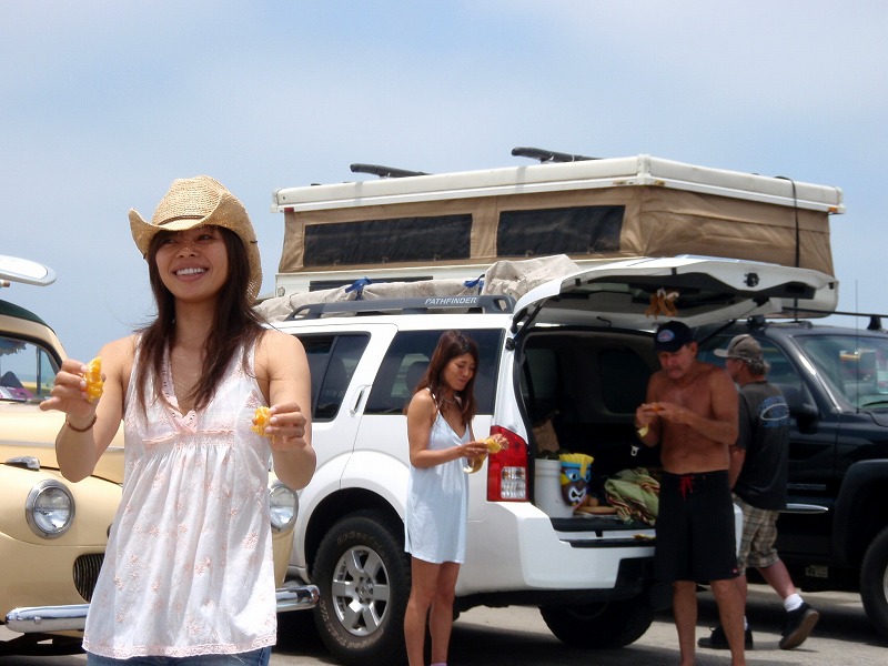 気温も波も上がり、駐車場は大混雑。待機中にチャンゴから甘いオレンジのお裾分けです。
