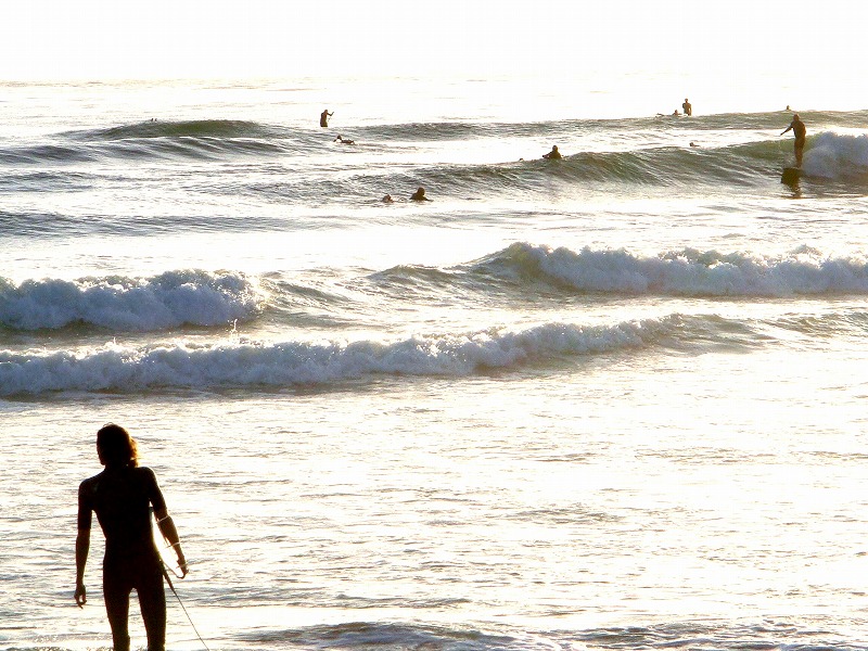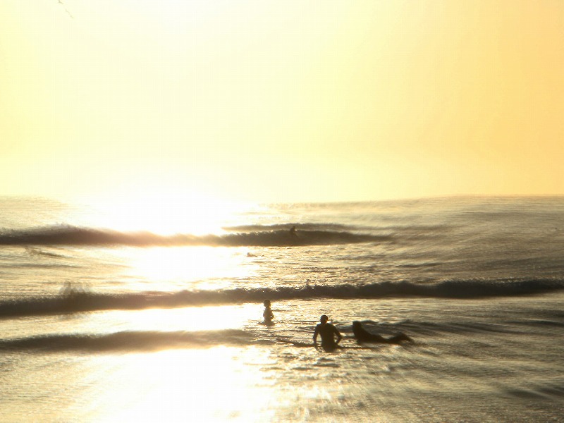 はやる気持ちを抑え、夕陽を見ながら日没直前にロングボードでゆっくり入水しました。