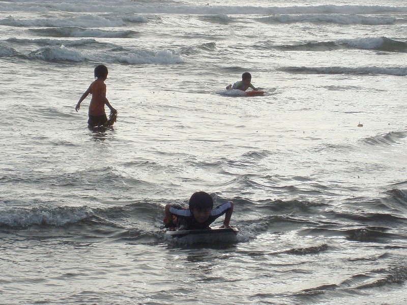 子供たちも河口の暖かい水でそれぞれ波乗りを楽しんでいる。