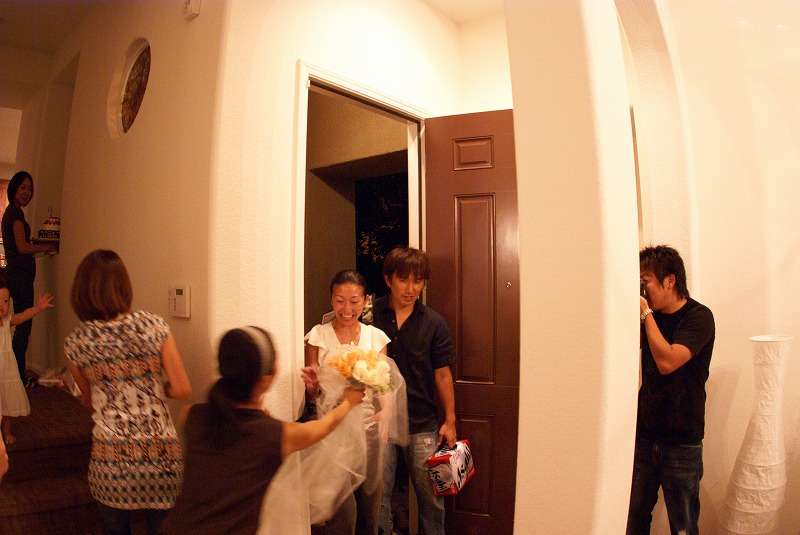 主役が到着!と同時に、MayumiとTedがウエディングマーチを奏で、ちなちゃんがブーケを渡し、Asakoがケーキを持ってスタンバイ。