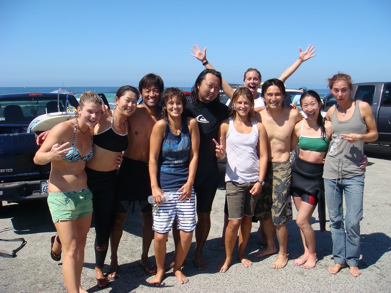 1週間後の試合に向けて選手たちも続々登場し、大会ポスターモデルのカシア・ミーダー(左から4人目)やジェン・スミス(右から5人目)らROXYガールズとカシャリ。