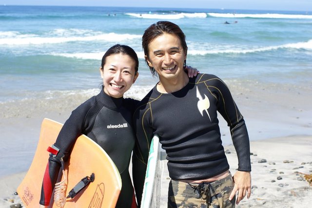 今朝はウィンドスウェルの膝波の中、日本から来ているRieちゃんと海の上で初対面。いつにもまして笑顔のNobutatsuとのナイスカップルです。