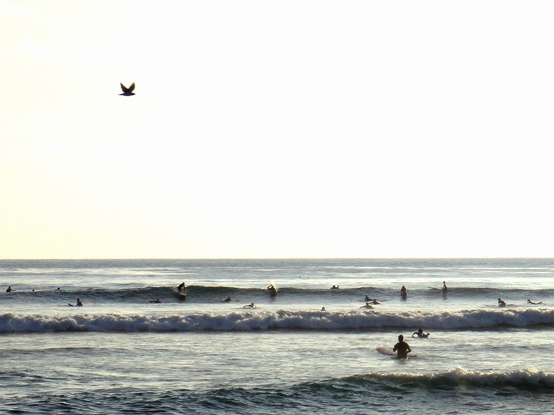 夏の夕暮れの満潮リーフはうねり柄すばらしいレフトが割れることが多く、お馴染みのグウフィーフッターも次々に登場する。