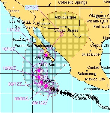 このままの進路だと観光地のカボサンルーカスあたりに直撃、そのままメキシコに上陸しそうです。サーファーの期待と反比例するが、この地域の被害が最小限に留まることを祈ります。