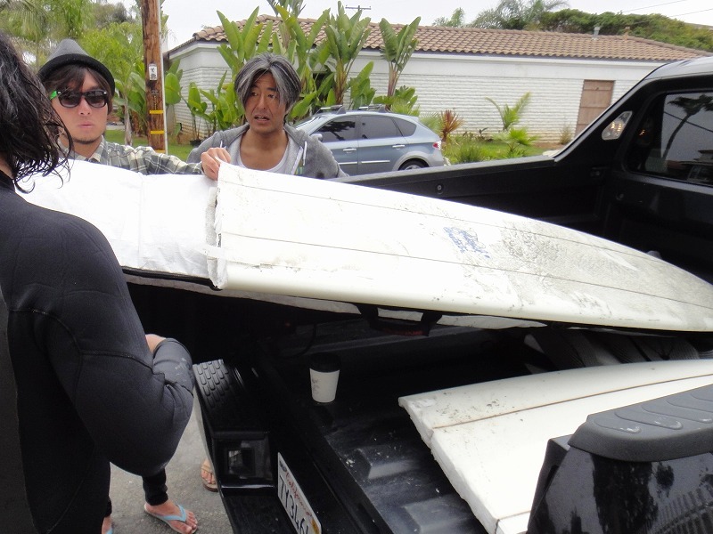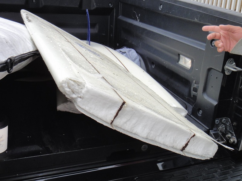 普段より3フィート強も短い板でこんなにも乗れたことに恍惚となって上がると、偶然セッションを共にしたShogo君のペネトレイターが真っ2つになって荷台に積まれていた。